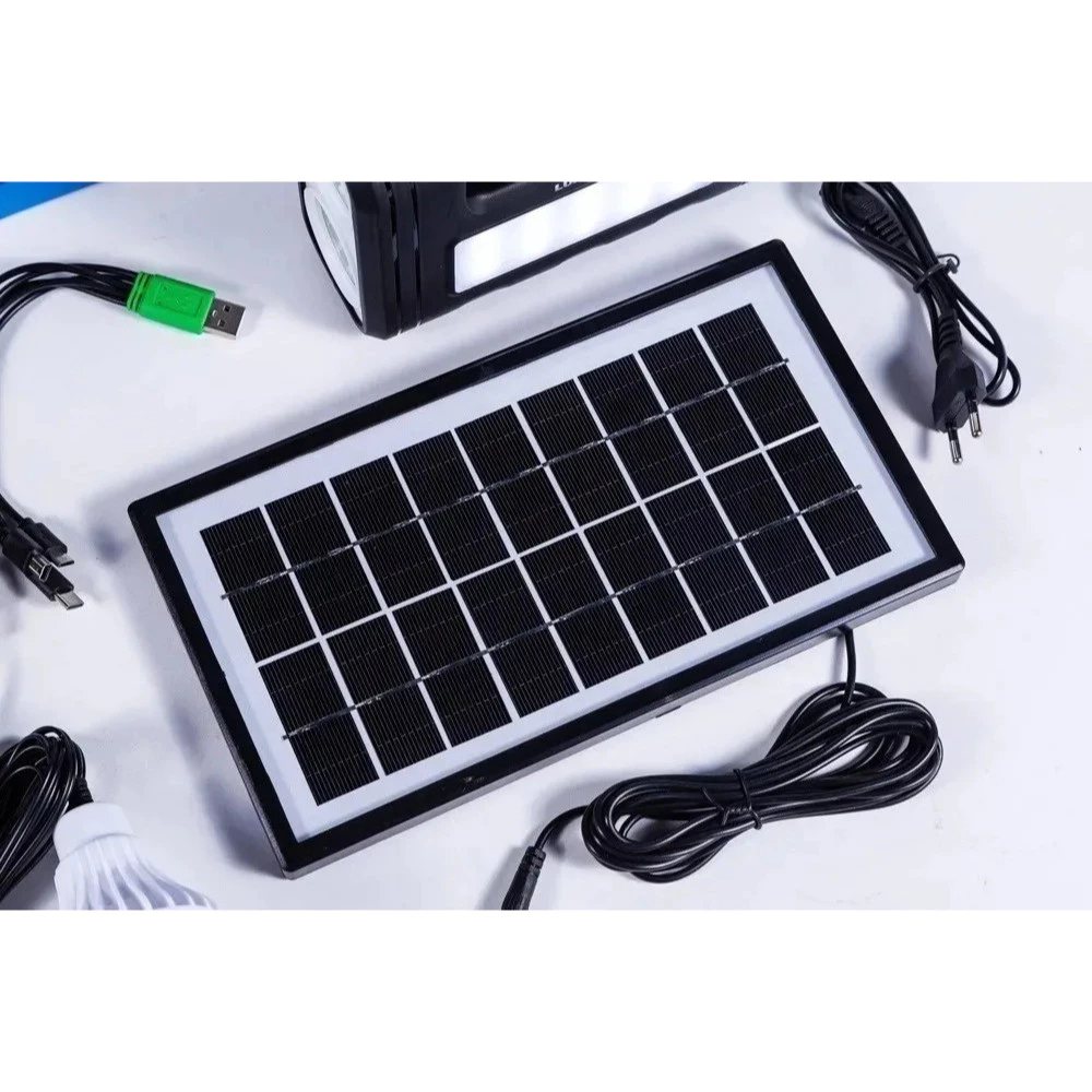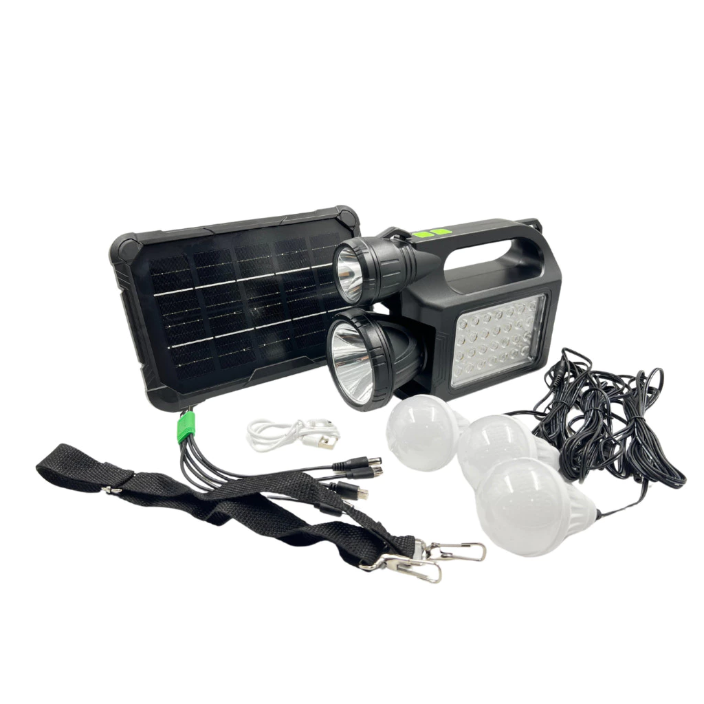 Kit Sistema de Luz Solar Recarregável com Bateria Portátil, Farol, Lanterna e 3 Lâmpadas LED