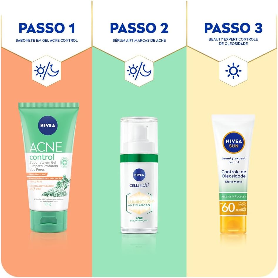 O sérum facial NIVEA Cellular Luminous 630® Antimarcas Acne é uma solução avançada para quem busca reduzir marcas escurecidas de acne e melhorar a aparência da pele. Com fórmula desenvolvida especialmente para peles mistas, oleosas e com tendência à acne, ajuda a uniformizar o tom da pele enquanto controla a oleosidade. Sua composição conta com ácido salicílico, que promove uma leve esfoliação e melhora a textura da pele, além do ácido hialurônico, que auxilia na hidratação e prevenção de sinais de envelhecimento. A tecnologia Luminous 630® atua diretamente nas marcas, contribuindo para uma pele mais iluminada e uniforme com o uso contínuo. Possui textura leve, efeito matte e não obstrui os poros, sendo ideal para uso diário. Também conta com FPS 60, oferecendo alta proteção contra os danos causados pelo sol. Características • Reduz marcas escurecidas de acne • Contém ácido salicílico com ação esfoliante • Possui ácido hialurônico para hidratação da pele • Tecnologia Luminous 630® para uniformização do tom • FPS 60 com alta proteção solar • Efeito matte com controle de oleosidade • Textura leve e de rápida absorção • Não obstrui os poros • Dermatologicamente testado Benefícios • Ajuda a reduzir marcas de acne em poucas semanas • Uniformiza o tom da pele • Controla a oleosidade ao longo do dia • Melhora a textura e aparência da pele • Previne sinais de envelhecimento • Proporciona pele mais iluminada e saudável Conteúdo da embalagem • 1 Sérum facial 30ml Indicado para quem deseja cuidar da pele acneica, reduzir manchas e conquistar uma aparência mais uniforme, hidratada e protegida no dia a dia.