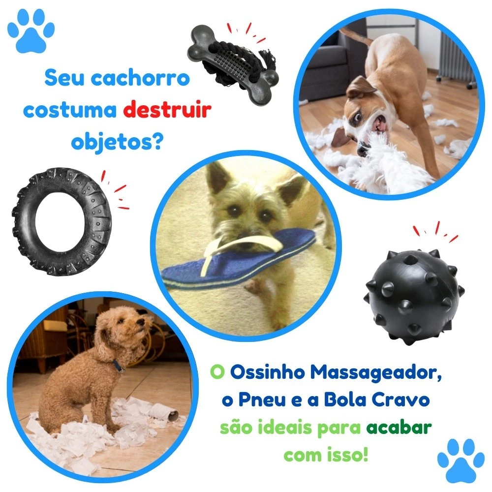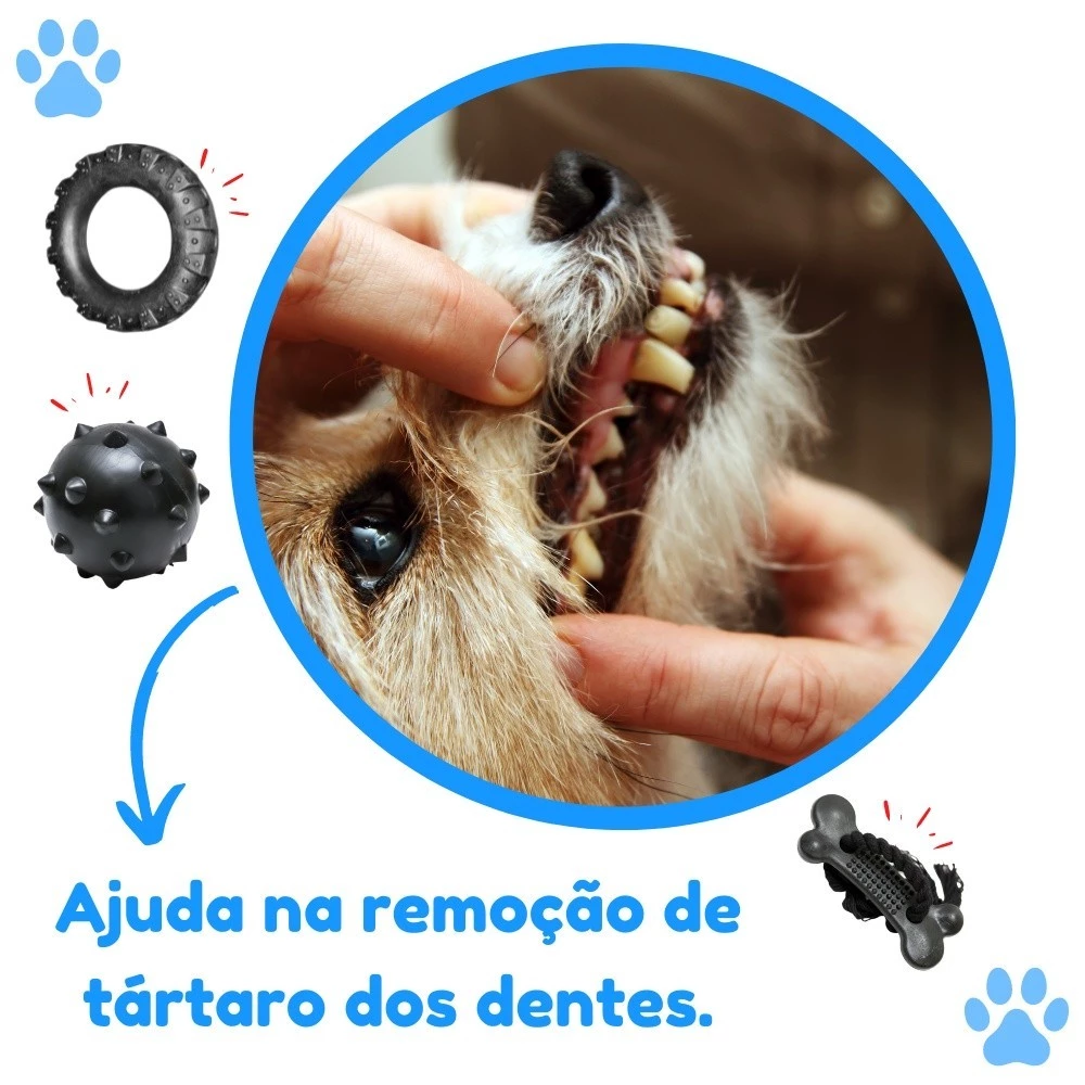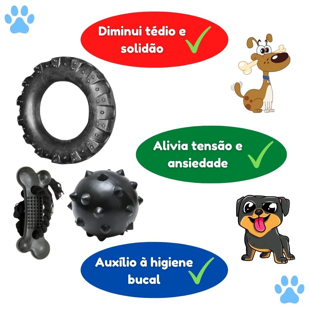 Kit Brinquedos para Cachorro Pneu de Borracha + Bola Cravo 75mm + Osso com Corda
