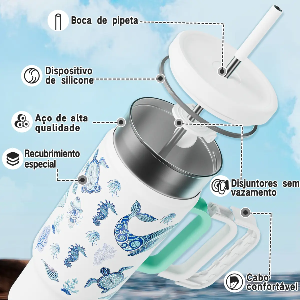 O copo térmico MEOKY de 1200 ml é ideal para quem busca praticidade no dia a dia, mantendo bebidas frias por mais tempo. Fabricado em aço inoxidável com isolamento de parede dupla, ele ajuda a conservar a temperatura da bebida enquanto oferece resistência e durabilidade. O modelo conta com tampa, canudo reutilizável e alça ergonômica que facilita o transporte e o uso em diferentes situações, como no carro, no escritório ou durante viagens. Além disso, possui efeito luminescente que brilha no escuro após exposição à luz, adicionando um visual diferenciado ao produto. Características • Copo térmico de grande capacidade (1200 ml) • Fabricado em aço inoxidável resistente • Isolamento térmico de parede dupla • Tampa com canudo reutilizável • Alça larga para pegada confortável • Base antiderrapante para maior estabilidade • Efeito luminescente que brilha no escuro Benefícios • Mantém bebidas frias por mais tempo • Capacidade ideal para evitar reabastecimentos frequentes • Fácil de transportar para trabalho, viagens ou passeios • Design moderno com acabamento diferenciado • Uso prático no dia a dia Especificações Marca: MEOKY Capacidade: 1200 ml (40 oz) Material: Aço inoxidável com isolamento térmico Estilo: Moderno com efeito brilho no escuro Formato: Redondo Base: Antiderrapante Faixa etária: Adulto Cuidados: Lavar apenas à mão Dimensões Largura aproximada: 5,57 pol Altura aproximada: 11,65 pol Peso aproximado: 1,46 lb Conteúdo da embalagem • 1 Copo térmico com alça • 1 Tampa • 1 Canudo reutilizável Observação Para ativar o efeito luminescente, o copo deve ser exposto à luz solar ou artificial por algumas horas antes de ser utilizado no escuro.
