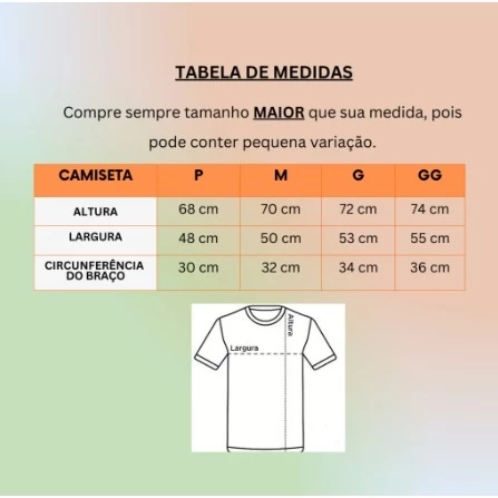 O kit com 5 camisetas Dry Fit é ideal para quem busca conforto e praticidade durante atividades físicas ou no uso casual. Produzidas em poliéster leve e respirável, ajudam na ventilação e no conforto durante treinos, corridas, pedaladas ou no dia a dia. As camisetas possuem modelagem confortável, gola redonda e tecido de secagem rápida, oferecendo ótimo ajuste ao corpo e liberdade de movimento. Características • Kit com 5 camisetas • Tecido Dry Fit em poliéster leve • Gola redonda • Secagem rápida • Conforto para atividades físicas • Ideal para academia, corrida, bike e uso casual Tabela de Medidas P — Altura: 68 cm | Largura: 48 cm | Manga: 28 cm M — Altura: 70 cm | Largura: 50 cm | Manga: 28 cm G — Altura: 72 cm | Largura: 53 cm | Manga: 31 cm GG — Altura: 74 cm | Largura: 54 cm | Manga: 34 cm Produto versátil que combina conforto, leveza e ótimo custo-benefício para o dia a dia e para a prática de esportes.