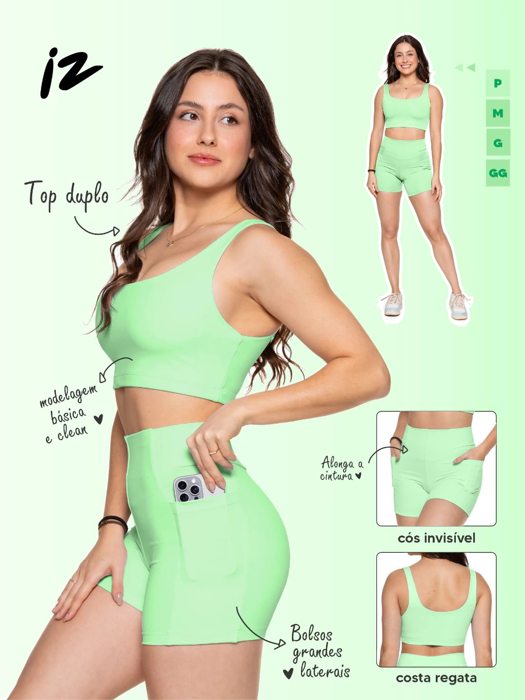 O conjunto fitness feminino com short e top duplo foi desenvolvido para oferecer conforto, sustentação e liberdade de movimento durante os treinos. Com modelagem ajustada e cintura alta, valoriza a silhueta e proporciona segurança em qualquer atividade física. Produzido em poliamida com elastano, possui tecido resistente, elástico e respirável, ideal para academia, corrida, crossfit, ciclismo, yoga e outras atividades. Características • Conjunto com short e top duplo • Tecido: 84% poliamida e 16% elastano • Cintura alta com ajuste confortável • Short com bolsos laterais funcionais • Top com dupla camada para maior sustentação • Abertura interna para bojo (bojo não incluso) • Tecido resistente e de alta elasticidade • Ideal para academia, corrida e treinos Tamanhos Disponíveis P | M | G | GG Conjunto confortável e funcional que combina estilo, sustentação e liberdade de movimento para treinos e atividades do dia a dia.